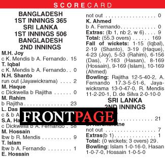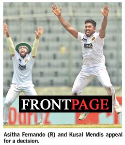 At the other end, Ramesh Mendis spun one into the pads of Mosaddek Hossain, who missed a lap sweep and was ajudged lbw. This was the only wicket the Sri Lanka spinners claimed throughout the whole match. Asitha and Kasun Rajitha, who removed the dangerous Mushfiqur Rahim earlier in the day, claimed 17 wickets between them.