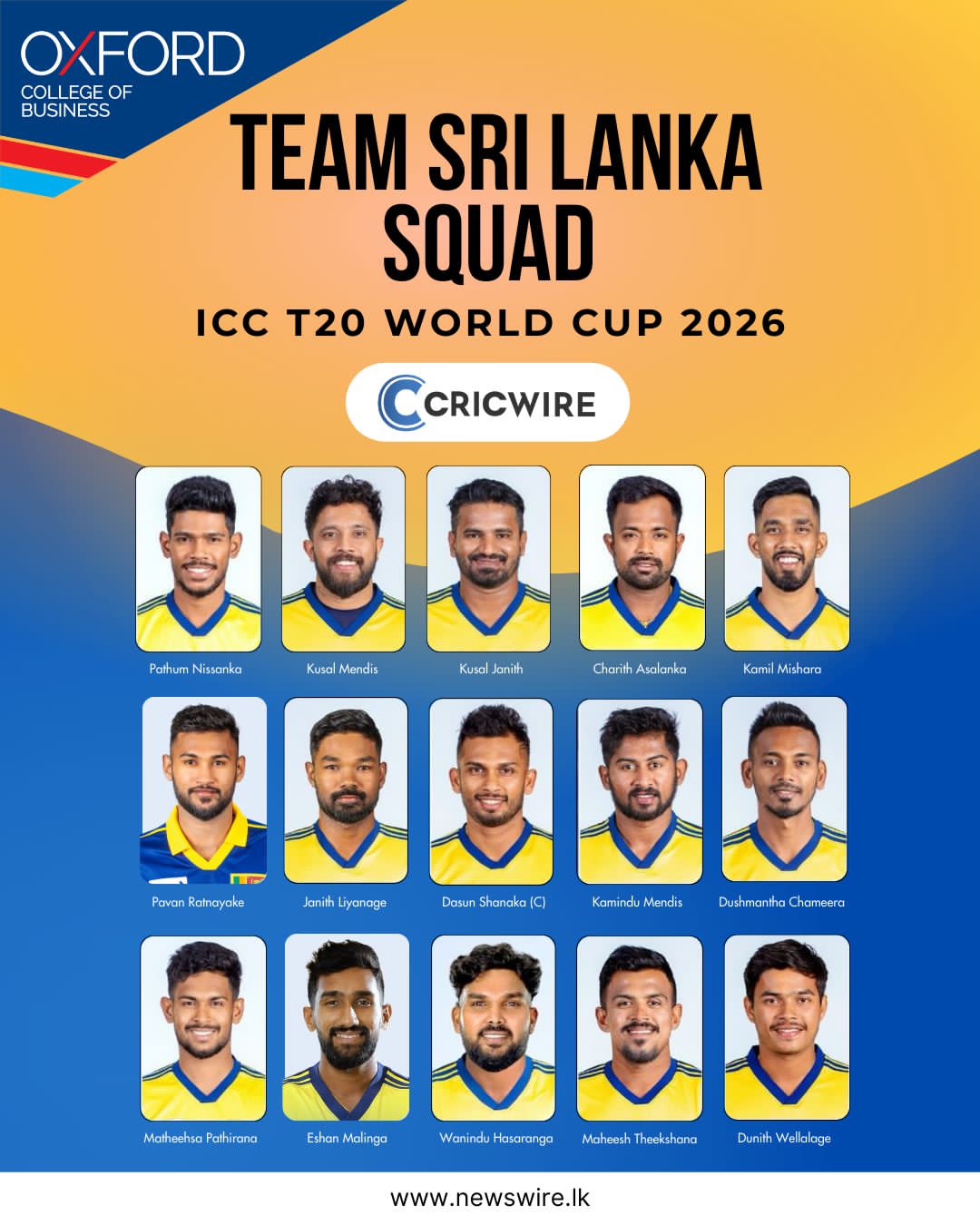 Sri Lanka’s T20 World Cup 2026 squad officially submitted to ICC Local On Feb 2, 2026 IMG 20260201 WA0021 0 1 Share Official: Sri Lanka have formally submitted their squad for the ICC Men’s T20 World Cup 2026 to the ICC The post Sri Lanka’s T20 World Cup 2026 squad officially submitted to ICC appeared first on Newswire. 0 1 Share FacebookTwitterGoogle+ReddItWhatsAppPinterestEmail