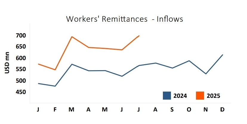 The increase reflects a 9.7% month-on-month growth and continued strength in external income sources. Compared to July 2024, when remittances stood at USD 576.7 million, the latest figure marks a year-on-year rise of nearly 21%.
