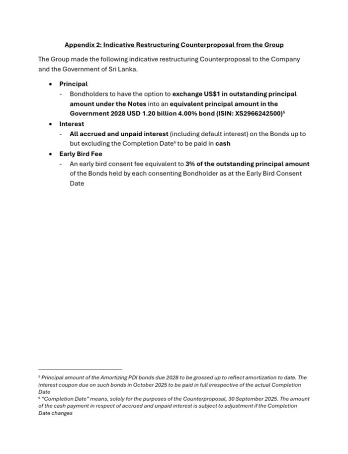The bondholder group countered with a proposal seeking full principal recovery via an exchange into 2028 sovereign bonds, payment of all accrued and unpaid interest in cash, and an early bird consent fee of 3% of the principal.