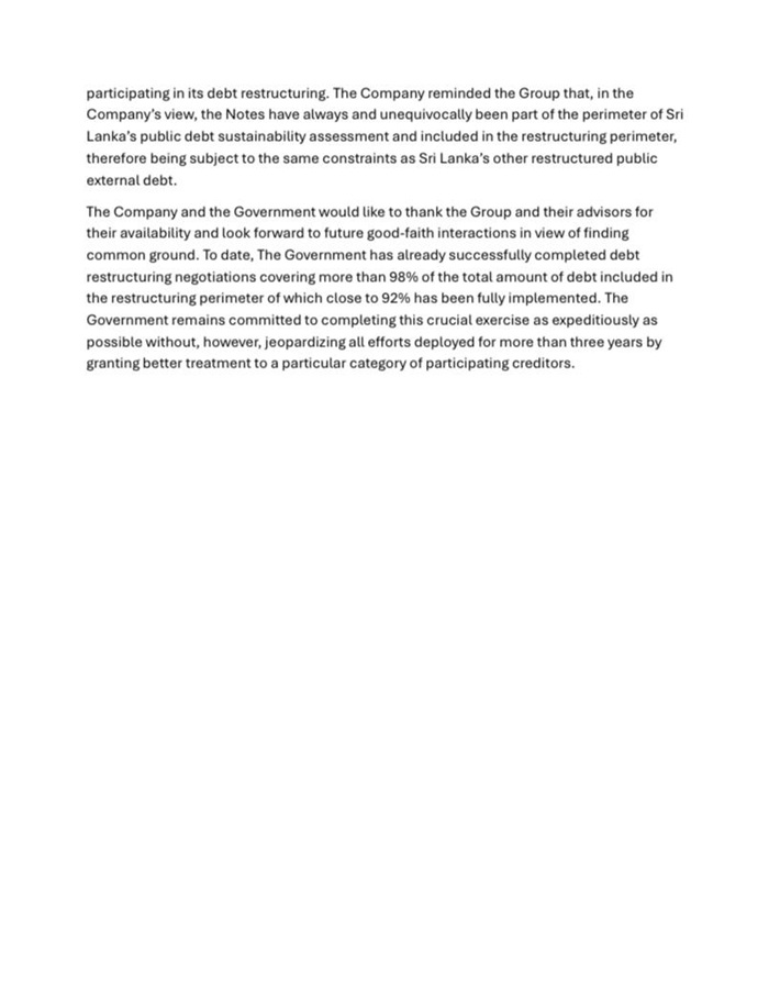 The government noted that over 98% of eligible public debt has already been addressed through prior agreements, of which 92% has been implemented. It reiterated its commitment to equal treatment among all creditors and emphasized that SriLankan Airlines’ bonds are part of the broader restructuring perimeter.