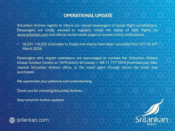 SriLankan Airlines has announced the cancellation of flights UL231 and UL232, operating between Colombo and Dubai, from March 21 to 24, 2026.