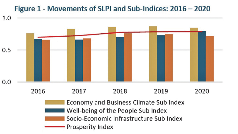 Accordingly, the Sri Lanka Prosperity Index (SLPI) marginally increased to 0.786 in 2020 compared to 0.783 recorded in 2019. The ‘Well-being of the People’ sub-index improved amidst the COVID-19 pandemic, while decreases were observed in the ‘Economy and Business Climate’ and ‘Socio-Economic Infrastructure’ sub-indices, during the year.