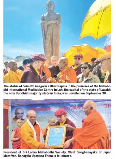 The Maha Bodhi Society recently unveiled a statue of Srimath Anagarika Dharmapala in Ladakh, India, as a tribute to his invaluable service for the revival of Buddhism.