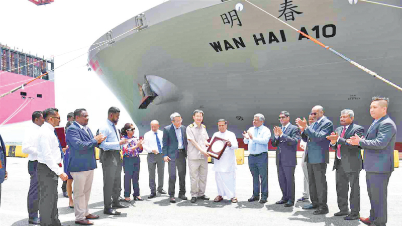 The MV WAN HAI A 10, measuring 335 meters in length and 51 meters in width, called at the POC today sails under the Singapore flag. With a draft of 51 meters, this vessel has a capacity of 14,000 TEUs. Mclarens Shipping Limited serves as the local agent for this vessel. In celebration of this milestone, a welcome ceremony was held at the terminal with the initiative of the Minister where he exchanged plaques with the Master of the vessel Capt. HU XIAOMING to mark the inaugural call of the vessel at the POC.