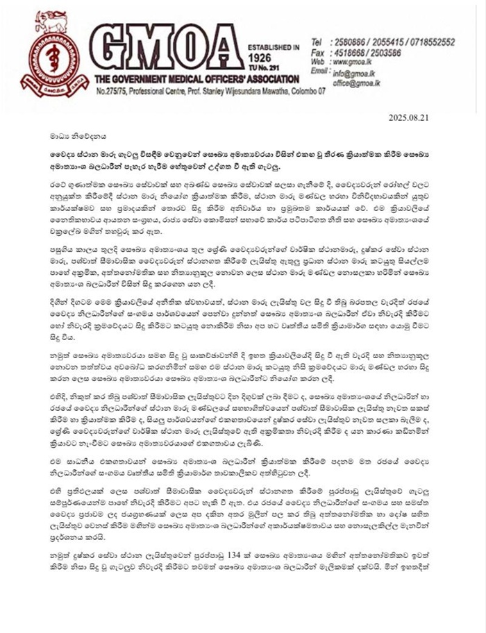 The Government Medical Officers’ Association (GMOA) has announced it will launch a trade union action from Monday (25 Aug) in protest against alleged irregularities in the transfer of doctors by the Health Ministry.