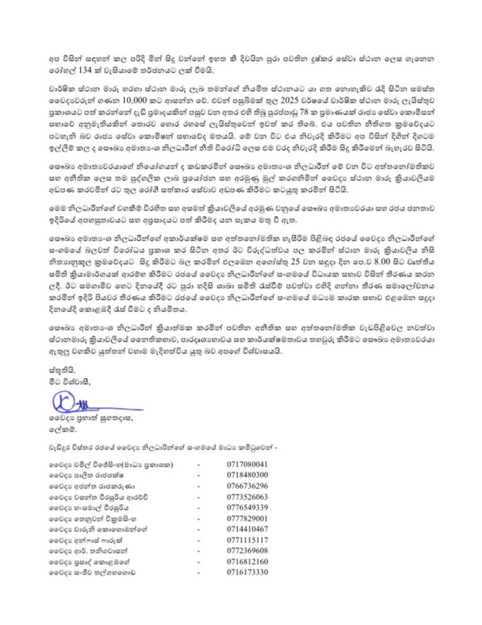 In a statement, the GMOA accused ministry officials of ignoring the Health Minister’s directives and acting arbitrarily in preparing annual transfer lists, including post-intern and difficult service placements.