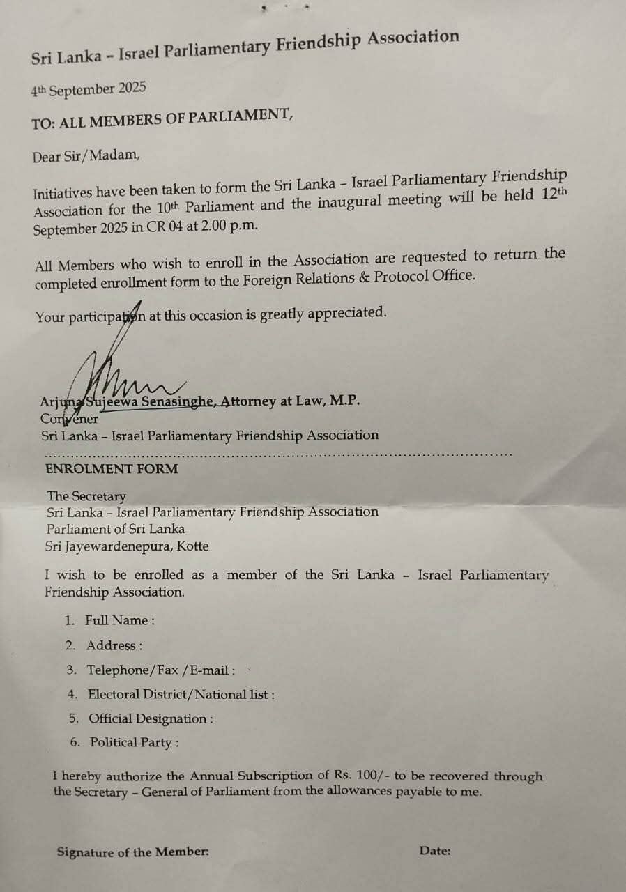“The letter signed by me convening the Israel–Sri Lanka friendship society was a genuine mistake. I have already informed the relevant authorities that I would withdraw that letter with immediate effect and to take necessary steps to cancel the same,” Senasinghe stated.