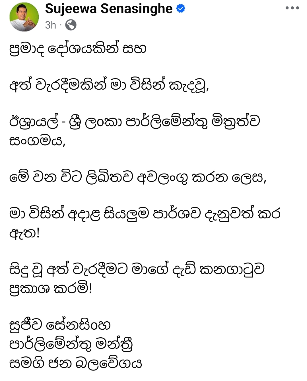 Samagi Jana Balawegaya (SJB) Parliamentarian Sujeewa Senasinghe has withdrawn a letter convening the inaugural meeting of a proposed Sri Lanka – Israel Parliamentary Friendship Association, admitting it was issued by mistake.