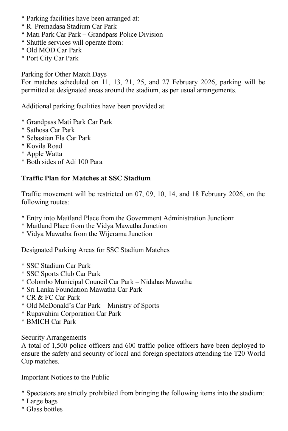 Special traffic arrangements will be enforced on February 8, 15, and 19, when Sri Lanka vs Ireland, India vs Pakistan, and Sri Lanka vs Zimbabwe matches are scheduled to be played at the R. Premadasa Stadium. On these days, dedicated shuttle services will operate from the Old MOD Car Park and Port City Car Park, while parking will be limited to the R. Premadasa Stadium Car Park and Mati Park Car Park under the Grandpass Police Division.