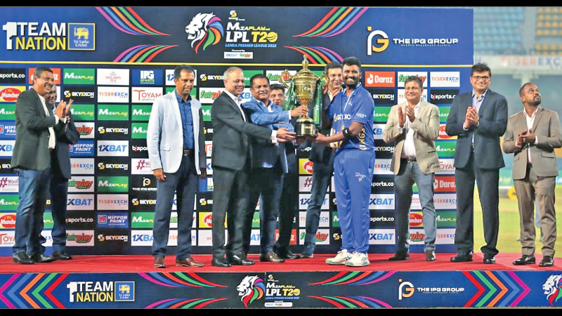 Jaffna Kings skipper Thisara Perera receiving the LPL champions trophy from chief guest Sagala Ratnayake the chief advisor to the President, Shammi Silva President of SLC and Pakistan legend and Brand Ambassador of LPL Wasim Akram at the presentation ceremony. Also in the picture LPL tournament Director Samantha Dodanwela Derana Media Group Chairman Dilith Jayaweera and Ravin Wickramaratne the Vice President of SLC. (Pix curtecy SLC)