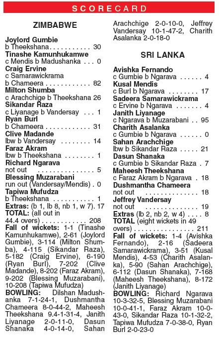 Skipper Craig Ervine used his full strength to make some pressure for Sri Lanka bowlers while skipper Kusal Mendis has to use eight bowlers to restrict Zimbabwe innings. Ervine the most successful batter of Zimbabwe was in good touch with the bat but Sadeera Samarawickrama took a superb one handed catch at point off the bowling of Dushmantha Chameera in 37th over which was the turning point of the Zimbabwe innings. Ervine hit nine fours and a six while Ryan Buri made 31 in 37 balls with a four and a six but Zimbabwe later order batsmen were unable to stay long and they were bundled out for 208 in 44.4 overs.