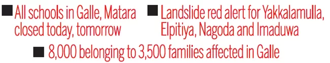 Accordingly, a red landslide alert has been issued for Yakkalamulla, Elpitiya, Nagoda and Imaduwa areas of Galle district, Ingiriya, Walallawita and Matugama areas of Kalutara district and Pitabeddara, Akuressa and Hakmana areas of Matara district.