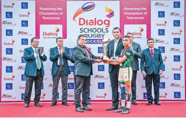 St.John’s College won the Dialog Schools Rugby Knockouts Chairman’s Trophy by beating Lalith Athulathmudali College 27 – 0. Here Captain Shiwantha Narada receives the Dialog School Rugby Knockouts Chairman’s Trophy from, Prashan Costa, Senior Manager – Marketing Operations – Group Marketing, Dialog Axiata and Kamal Ariyasinghe, President, SLSRFA. Also in the picture are :Damitha Perera – Treasurer, SLSRFA, Nirodha Wijerama – Secretary, SLSRFA, Dilruk Jayawardhana – Assitant Director – Physical Education and Sports, Ministry of Education PLC, Pubudu Aluthgedara, Head – Business – Media and Content , Dialog Axiata PLC and Buddika Aththanayake – Vice President, SLSRFA