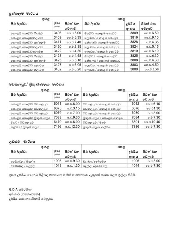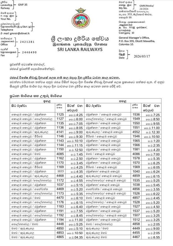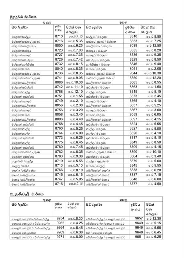 Additionally, 5 journeys on the Kelani Valley, 9 on the Puttalam, and 6 on the Batticaloa and Trincomalee lines will operate as scheduled.