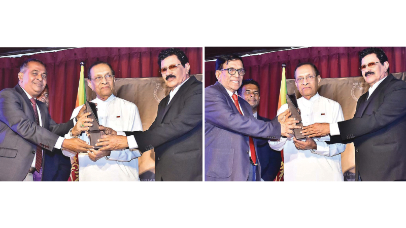 Mohamed Rasooldeen and Ruzaik Farook receiving their awards from former Speaker Karu Jayasuriya and Tower Hall Foundation Director Hassim Omar, as Ahasa Media Network Executive Director Saman Chandraratne looks on.