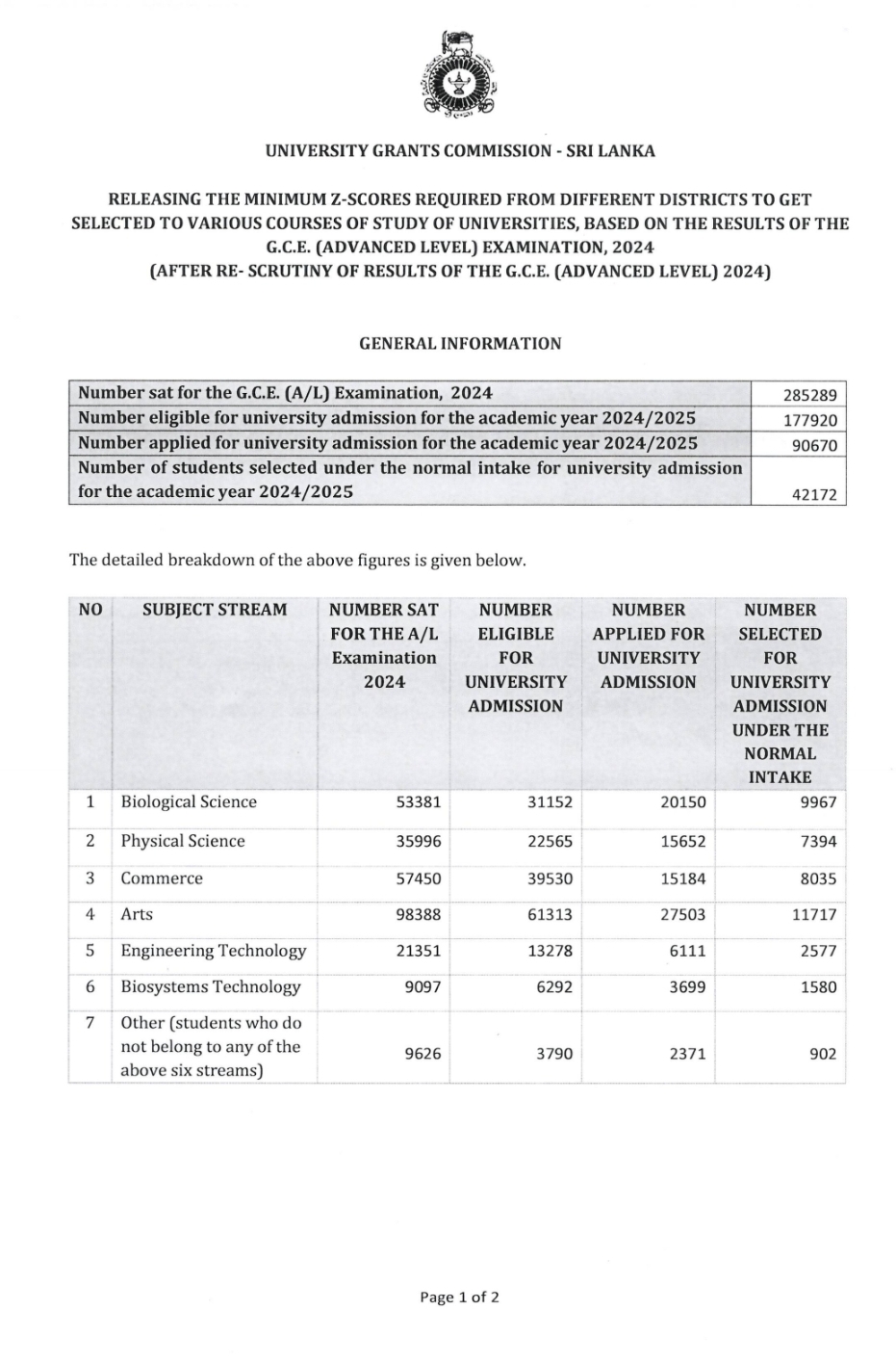 The University Grants Commission (UGC) has released the Z-Score cut-off marks for 2024/2025 university admission today.