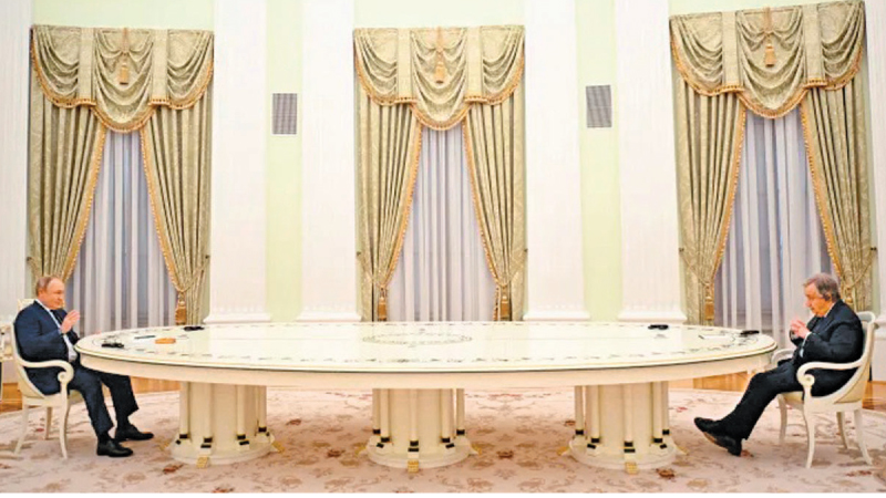 During the meeting, which the UN said lasted nearly two hours, Putin and Guterres sat at opposite ends of a long white table in a room with gold curtains bordered in red. No one else was at the table.