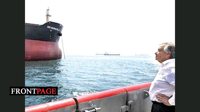 UN Secretary-General António Guterres observes the WFP ship SSI Invincible 2 in the Sea of Marmara headed to Ukraine to pick up the cargo of grain exported under the Black Sea Grain Initiative.