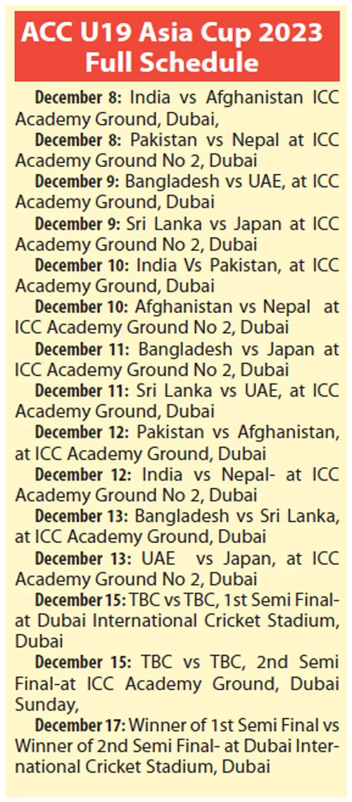 Asia cup comprises eight teams and we are in same group with Japan, UAE and Bangladesh while other group has India the defending champion, Pakistan, Afghanistan and Nepal. Our first task is to get two victories to enter the semi finals but we want to take match by match. My players have confidence after winning the ODI series against Pakistan in Pakistan. That was very tough tour but our players fought back strongly to win the series and skipper Sineth Jayawardena gave good leadership throughout the series. We have to play the Asia Cup in Dubai Academy ground 1 and 2 while final will be held at Dubai Main Cricket Stadium on December 17. Every match give good exposure for the players and we have good all round side with batting, bowling (both spin and fast bowling) and fielding are of a high standard . We have top order batting including inform opener Pulindu Perera while all rounder Dinura Kalupahana, spin all rounder Malsha Tharupathi are experienced players while Duvindu Ranatunga who did not play West Indies and Pakistan series due to injury once again back to the side. Garuka Sanketh the left arm paceman also in good form while all our players are fit said Jehan. Two reserve players Janith Fernando and Supun Waduge will go on this tour as travel reserves and if any player gets injured they will replace them, added Jehan. We never underestimate any team says skipper Sineth. Meanwhile Sri Lanka under 19 skipper Sineth Jayawardena said he is very confident to play this Asia Cup and want to produce best performance before the World Cup. We never underestimate any opponent and go to make plans match by match. We used to see Videos to get knowledge about opponent teams and my supporting staff gave good encouragement to us said Sineth who is also the Royal College skipper. We have to play first match against Japan on December 9 followed by December 11 against UAE and last league round match against Bangladesh on December 13.