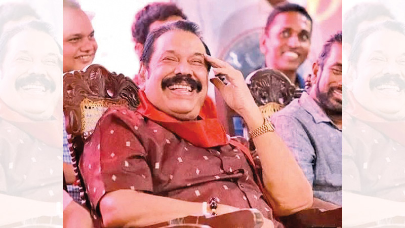 The Moneragala District summit of the Sri Lanka Podujana Peramuna was held in Moneragala yesterday under the patronage of Party Leader and former President Mahinda Rajapaksa. The former President at the summit sharing a light moment.
