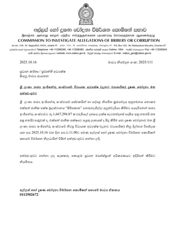 According to the Bribery Commission, he is scheduled to be presented before the Chief Magistrate of Colombo today. (Newswire)