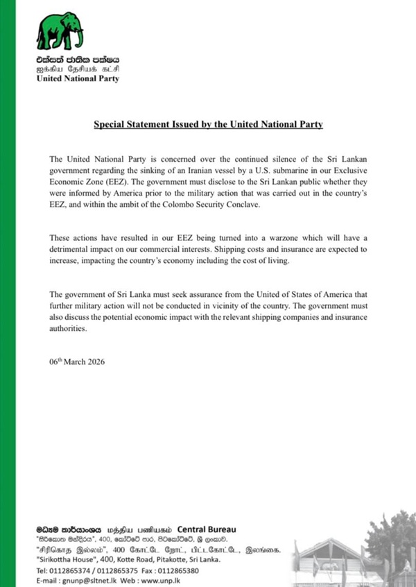 The United National Party (UNP) has expressed concern over the continued silence of the Sri Lankan government regarding the sinking of an Iranian vessel by a U.S. submarine within Sri Lanka’s Exclusive Economic Zone (EEZ).