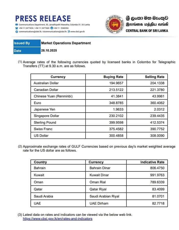Meanwhile, the selling rate of the Sri Lankan Rupee has also increased from Monday’s rate of Rs. 307.51 to Rs. 308 today.