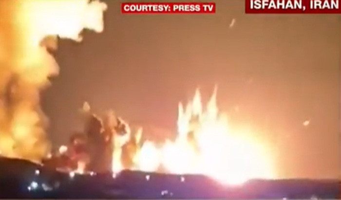 The footage shows a series of blasts, followed by massive fires lighting up the night sky in orange hues.