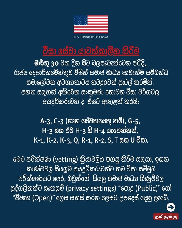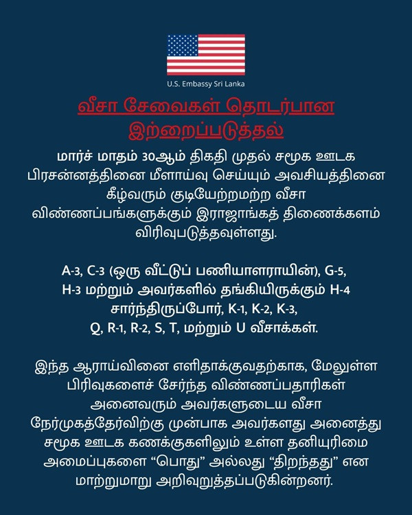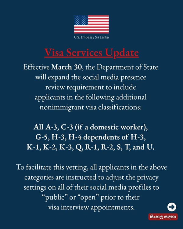 The U.S. Embassy in Sri Lanka has announced new requirements for non-immigrant visa applicants, effective immediately.