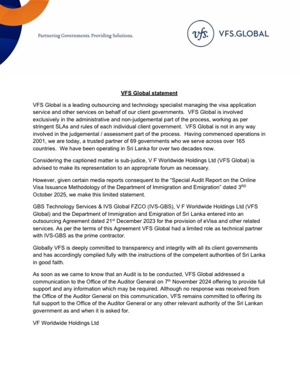 “As soon as we came to know that an Audit was to be conducted, VFS Global addressed a communication to the Office of the Auditor General on 7th November 2024, offering to provide full support and any information which may be required. Although no response was received from the Office of the Auditor General on this communication, VFS remains committed to offering its full support to the Office of the Auditor General or any other relevant authority of the Sri Lankan government, as and when it is asked for,” the company added. (Newswire)
