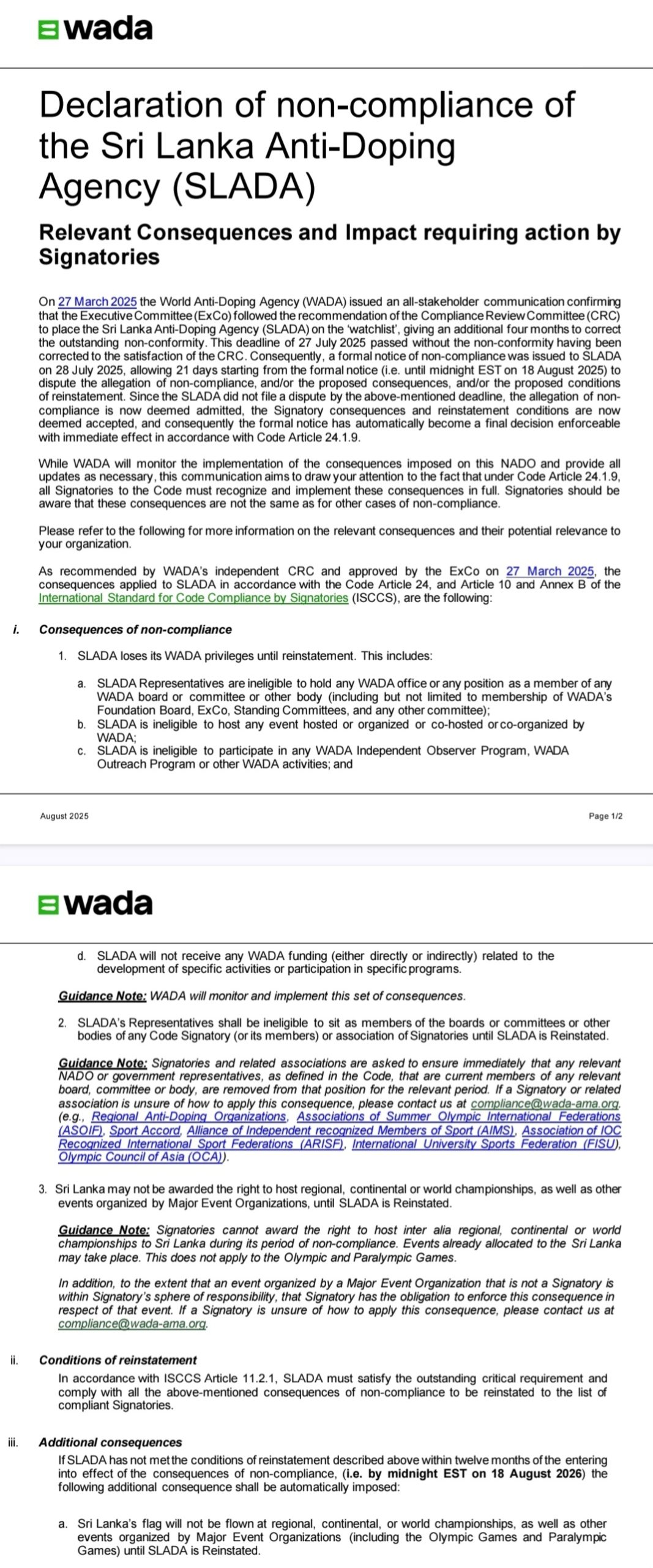 The World Anti-Doping Agency (WADA) confirms that, effective today the National Anti-Doping Organization (NADO) of Sri Lanka has been declared non-compliant with the World Anti-Doping Code (Code).