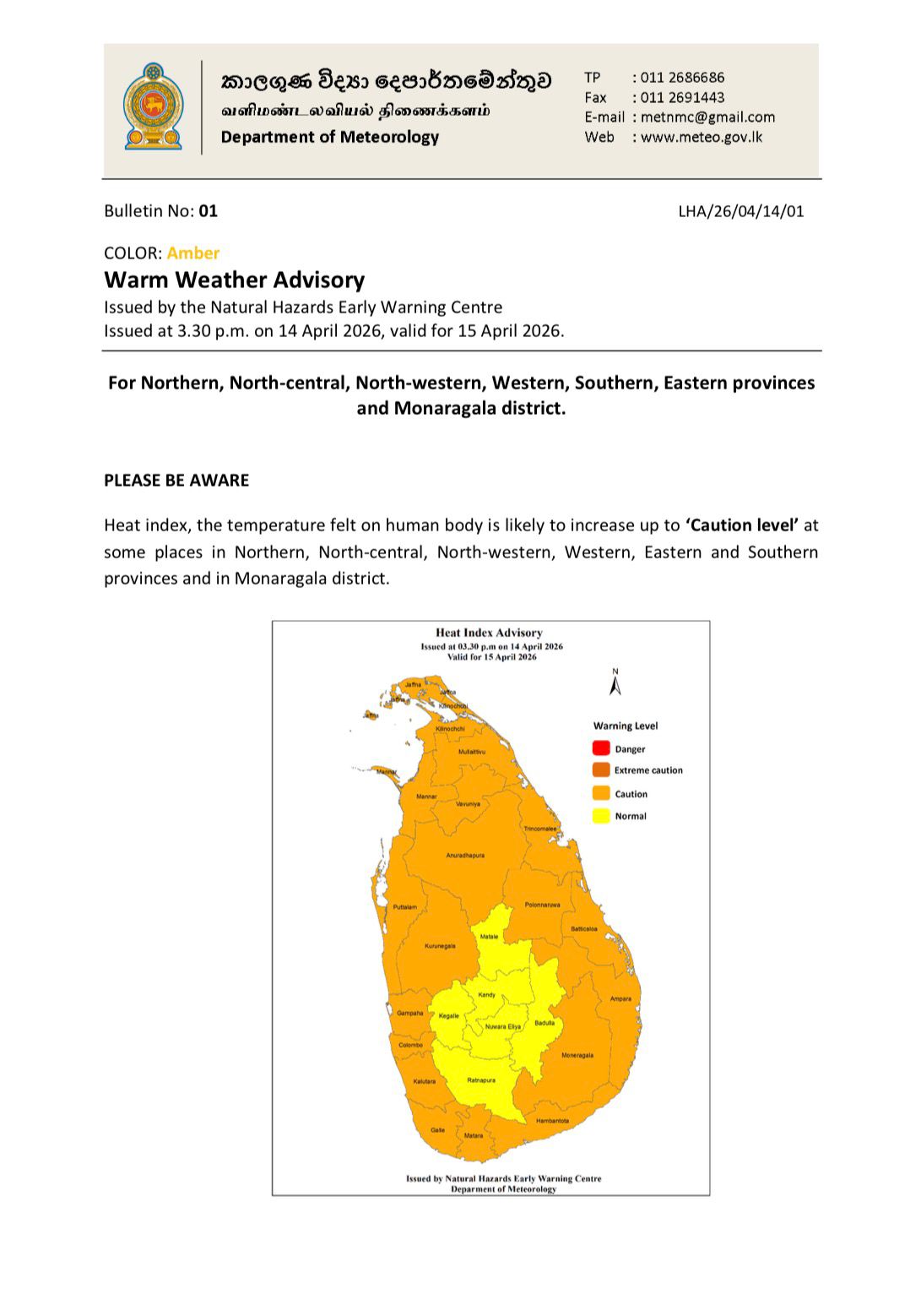 The Department of Meteorology has issued an amber-level warm weather advisory for 19 districts, warning of increased heat index levels tomorrow (April 15).