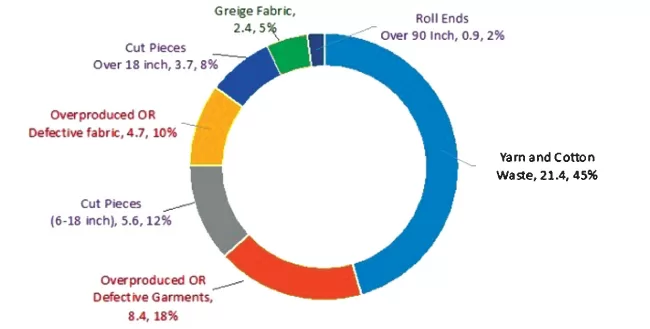 Yarn and Cotton Waste, 21.4, 45%, Overproduced OR Defective Garments,8.4, 18%, Cut Pieces (6-18 inch), 5.6, 12%, Overproduced OR, Defective fabric, 4.7, 10%, Cut Pieces Over 18 inch, 3.7, 8%, Greige Fabric, 2.4, 5%Roll Ends, Over 90 Inch, 0.9, 2% Yarn and cotton waste contribute to 21.4% of total wastage.