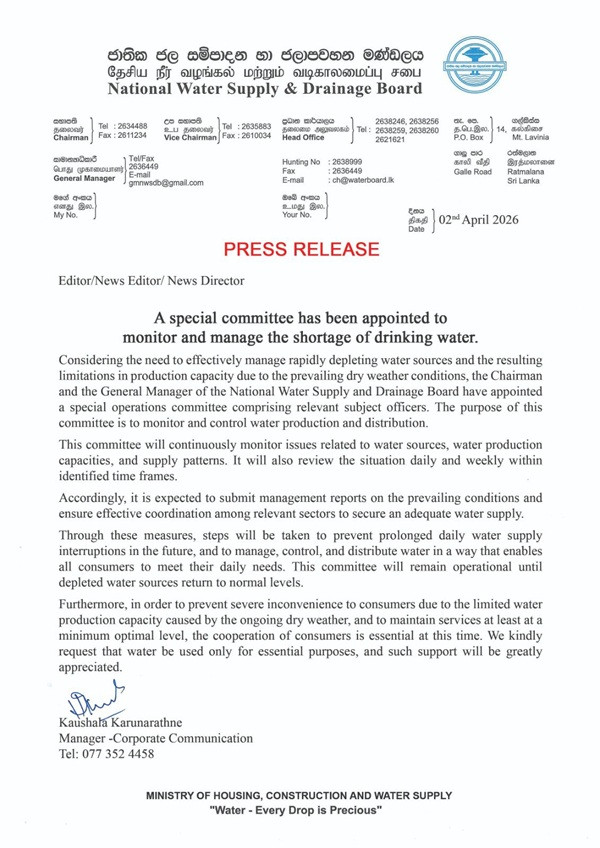 Furthermore, in order to prevent severe inconvenience to consumers due to the limited water production capacity caused by the ongoing dry weather, and to maintain services at least at a minimum optimal level, the cooperation of consumers is essential at this time. We kindly request that water be used only for essential purposes, and such support will be greatly appreciated, it added. (Newswire)