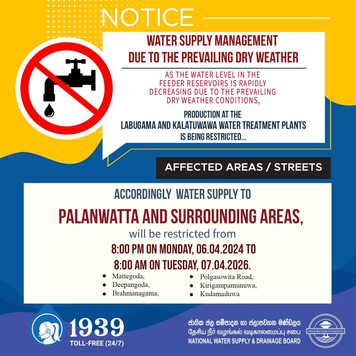 Accordingly, water supply to Palanwatta and surrounding areas will be restricted during the 12-hour period.