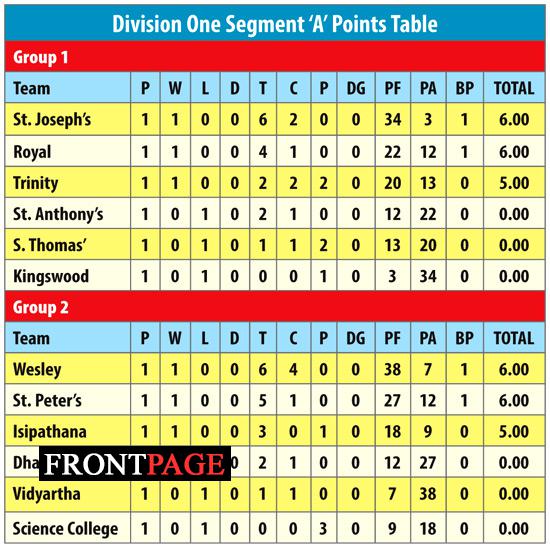 Wesley College and St. Joseph’s College took an early lead in the Inter-Schools Under-20 ‘A’ Division League Rugby Tournament points table after the completion of the first week of matches.