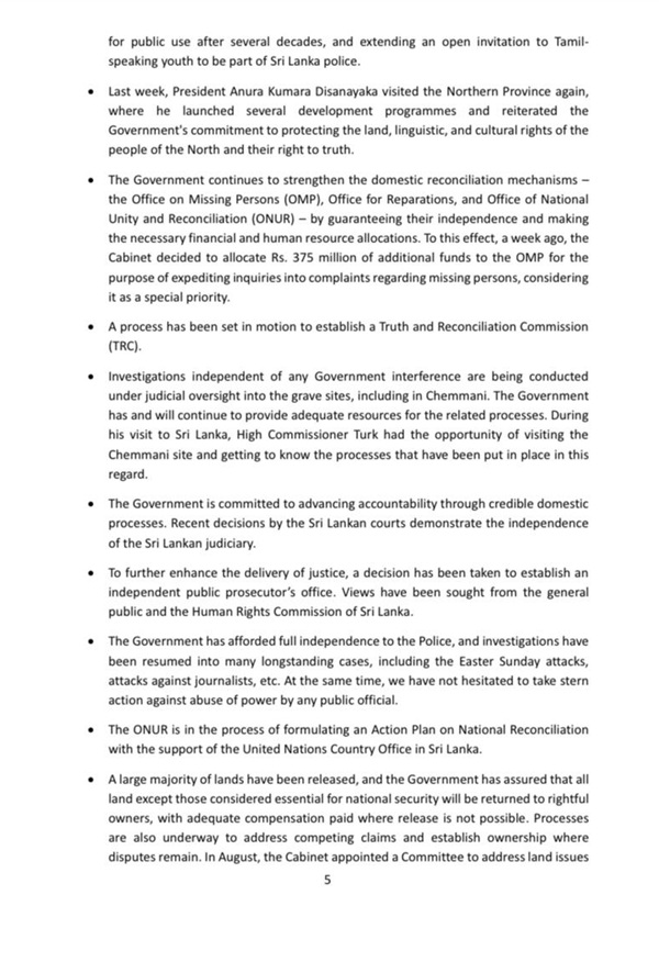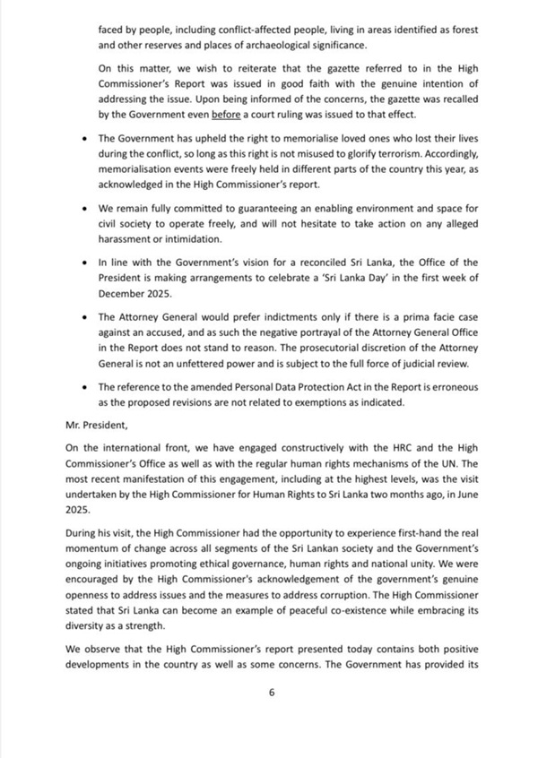 “I wish to recall that the political movement which I represent was the first to call for the establishment of a Truth and Reconciliation Commission, soon after the war ended in 2009, long before the UN highlighted this need. Our commitment in this regard is, therefore, not merely driven by the need to comply with the Human Rights Council or other human rights mechanisms and treaties. It is a commitment that arises from our principles and experience and the paramount need to ensure the rights and well-being of our own people.