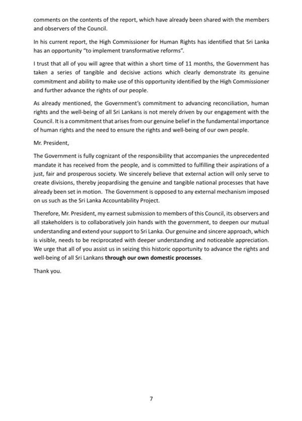“The Government is opposed to any external mechanism imposed on us such as the Sri Lanka Accountability Project. My earnest submission to members of this Council, its observers and all stakeholders is to collaboratively join hands with the government, to deepen our mutual understanding and extend your support to Sri Lanka. Our genuine and sincere approach, which is visible, needs to be reciprocated with deeper understanding and noticeable appreciation. We urge that all of you assist us in seizing this historic opportunity to advance the rights and well-being of all Sri Lankans through our own domestic processes,” the foreign minister said.