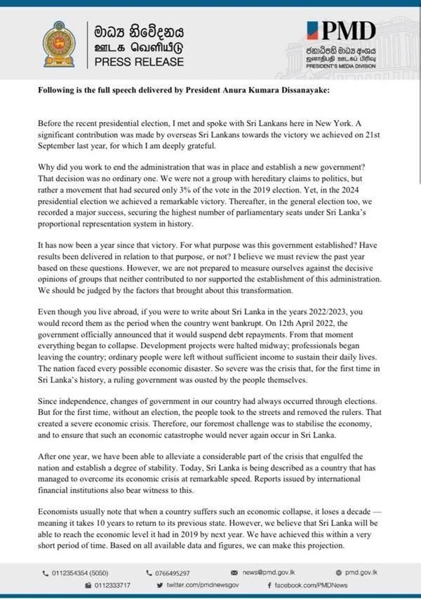 President Anura Kumara Dissanayake’s full statement; President meets Sri Lankans in NY