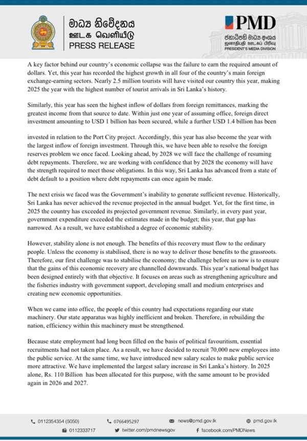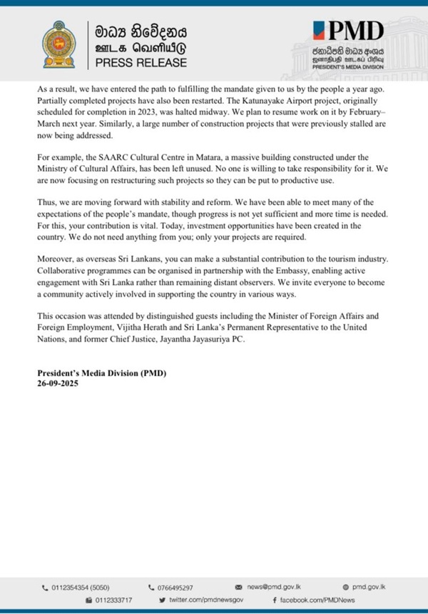 President Anura Kumara Dissanayake made these remarks while attending a meeting with the Sri Lankan community living in the United States, at the Center for the Arts, College of Staten Island in New York yesterday (25).