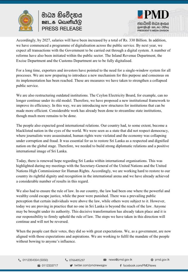 President Anura Kumara Dissanayake stressed that he is bound solely to the expectations and aspirations of the people of the country and that in fulfilling the expectations placed in the present Government by the people a year ago, he is not prepared to bow down to anyone’s influence.