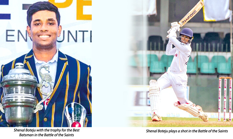 Shenal Boteju played school Cricket as a left handed opening batsman cum wicket keeper for his alma mater St. Peters College, Bambalapitiya and came up with two fighting knocks of 62 and 26 in the Big Match against St Josephs last week to rescue his team Speaking to Daily News Shenal said “Since I was small I was interested in sports and I wanted to play cricket.