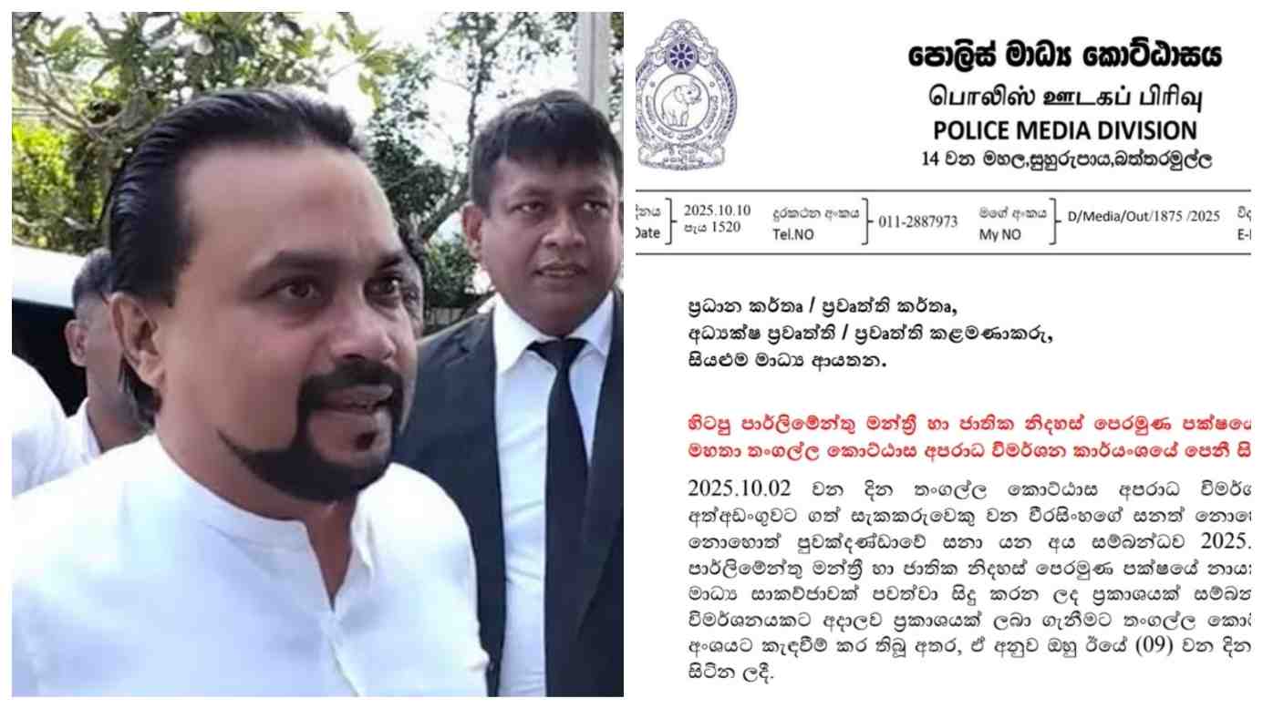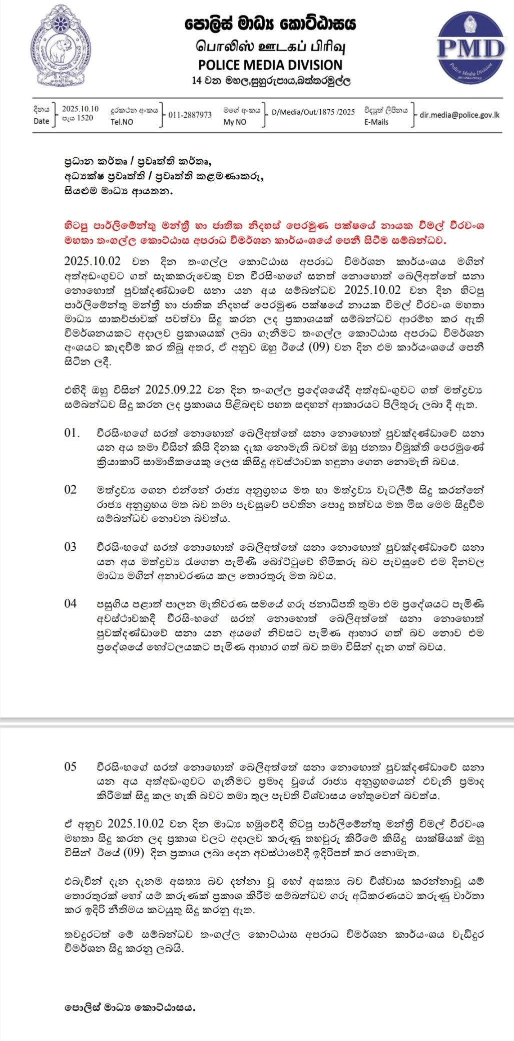 Police said the inquiry relates to remarks made by Weerawansa concerning the arrest of an individual known as Beliatte Sana, also identified as Puwakdandawa Sana.