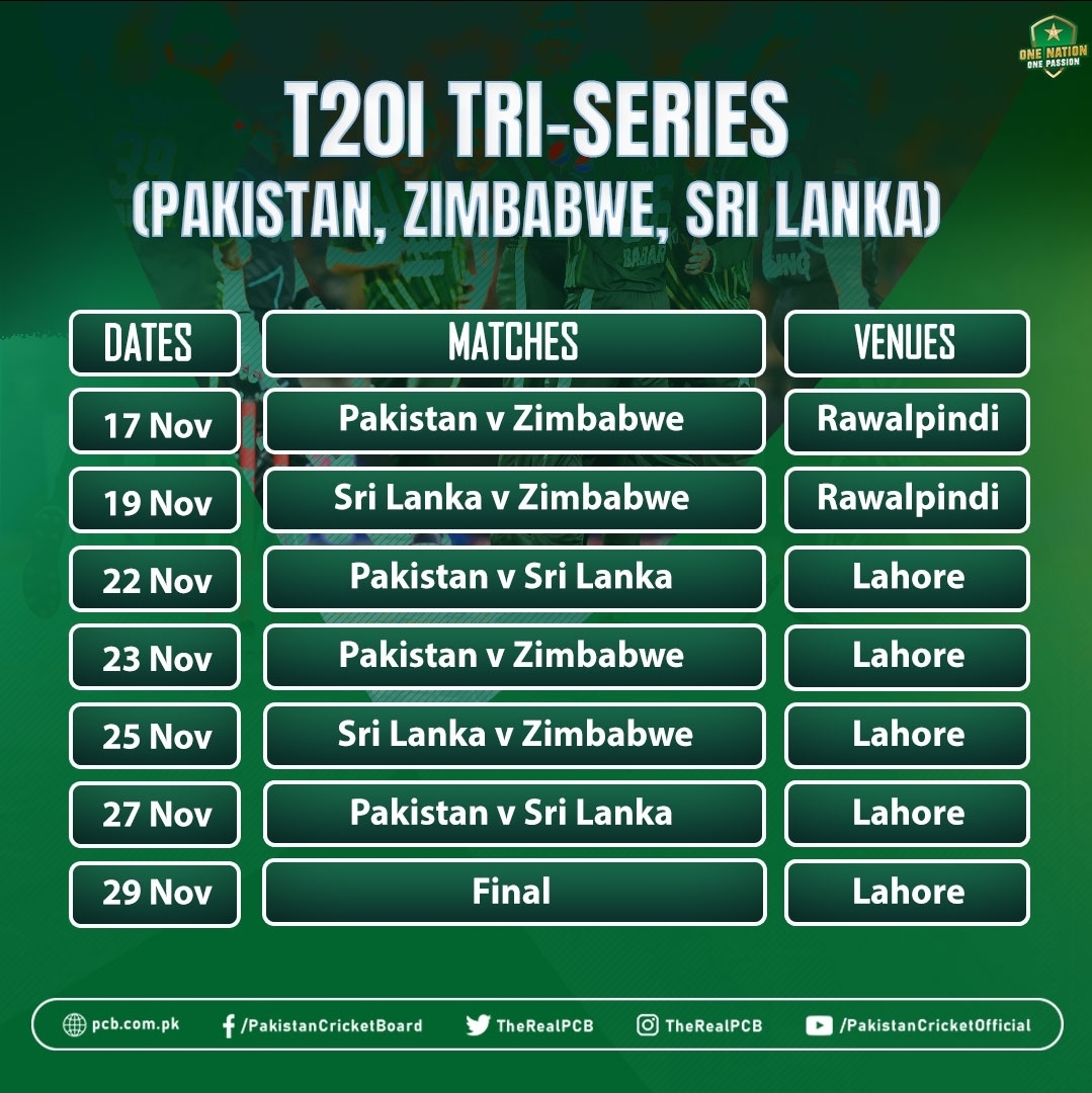 The tri-series will commence on 17 November, with hosts Pakistan taking on Zimbabwe at the Rawalpindi Cricket Stadium. The second fixture will also be played at the same venue on 19 November, when Sri Lanka take on Zimbabwe.