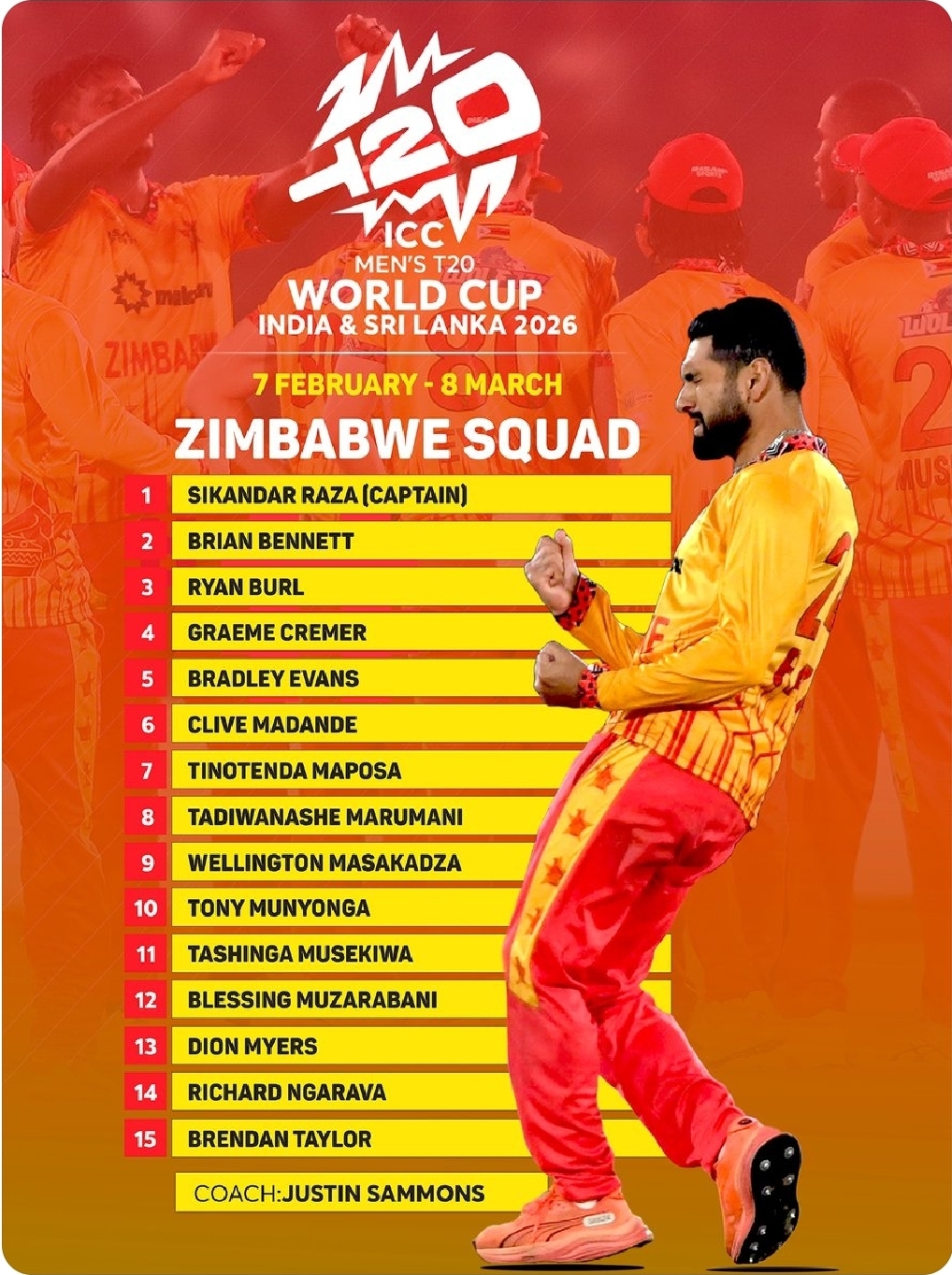 Zimbabwe Cricket has announced Zimbabwe’s 15-man squad for the ICC Men’s T20 World Cup 2026, which will be co-hosted by India and Sri Lanka from 7 February to 8 March.